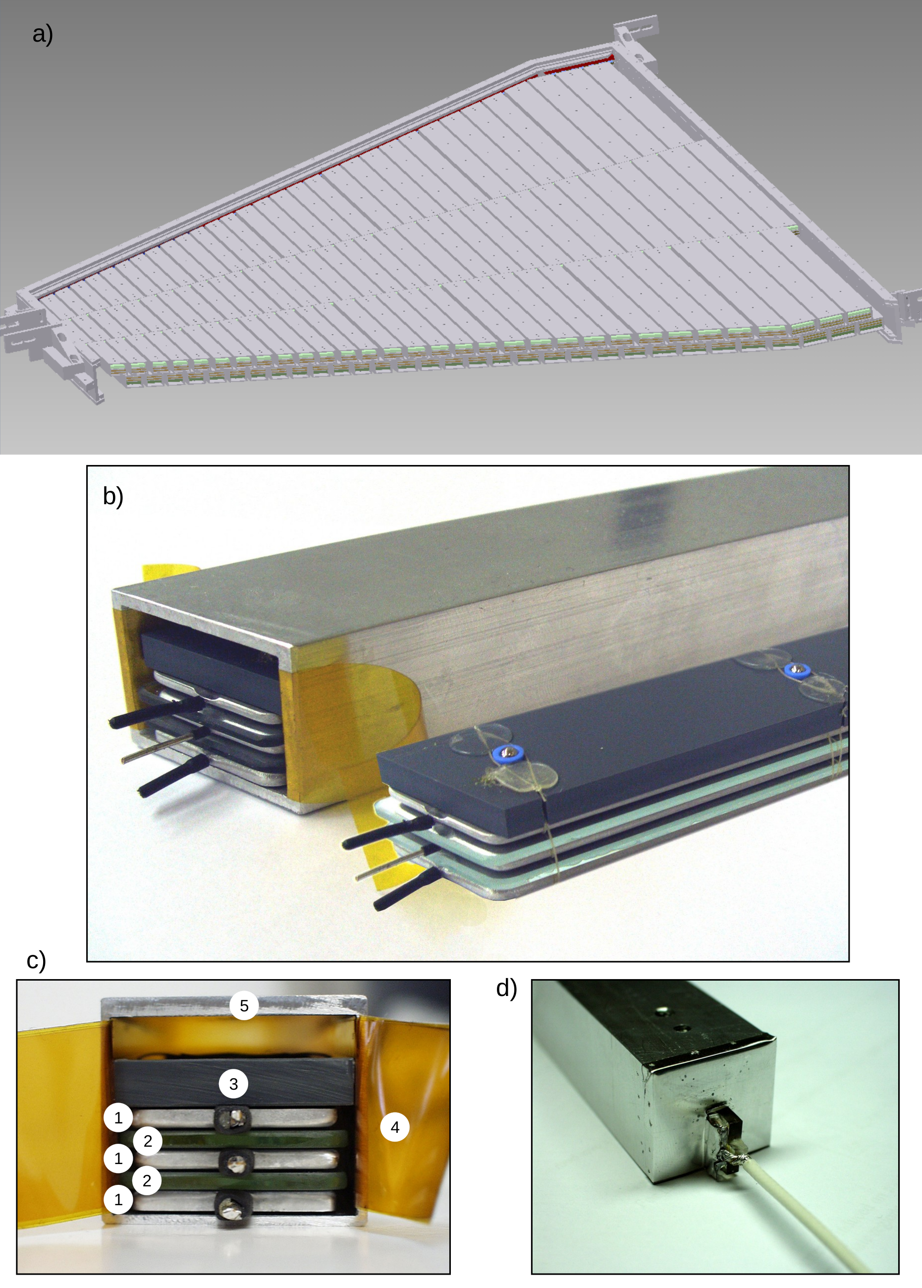 c. Internal structure of the cells: 1—Al electrodes; 2—glass electrodes; 3—plastic pressure plate; 4—kapton insulation; 5—2 mm thick Al shielding tube.